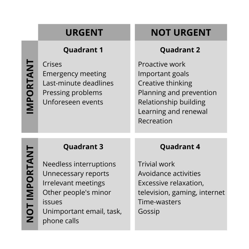 To identify the most important task on the right time Covey uses a time management matrix. This matrix is divided into the following 4 quadrants